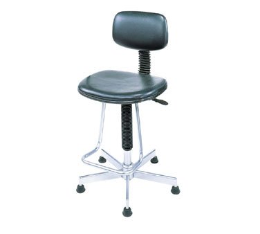 From Nexel Nexshelf Restaurant Shelving - Pneumatic Production Stool, without arms, vinyl, height adjustable 22"-32", 17"W x 16-1/2"D x 2" thick seat, 15"W x 9-3/4"H back adjustable 4" up or down and 2-1/2" in or out, chrome finished frame, 5-blade base, nylon floor glides, black - Your Source for Quality Restaurant Equipment and Supplies.