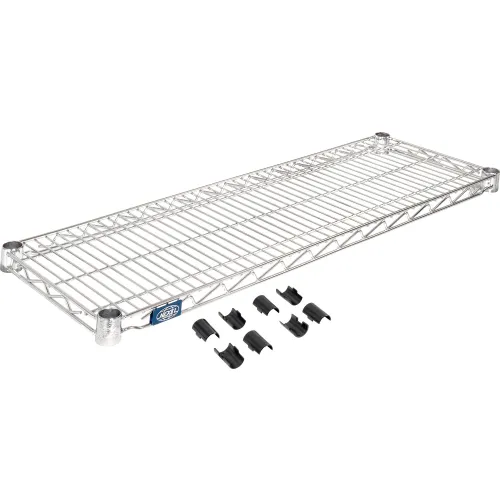 36"W x 12"D Chrome Wire Shelf. Customize your shelving unitswith additional shelves or mix shelves and posts to create a custom unit to maximize storage space. Chrome is an electro-plated nickel-chrome finish that is attractive enough for retail display, but withstands warehouse conditions as well. Open design to maximize air and light circulation and minimize dust accumulation. Includes 1 shelf and 4 shelf clips. Shelves easily adjust without tools at 1" increments. NSF approved. , Lot of 1