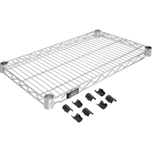 Design a strong, durable storage system to meet your needs with Nexel Chrome Wire Shelves and Posts. Solid shelf construction features thick diameter wire running front to back with additional truss supports to resist bending under heavy loads. Shelf collar slides over plastic snap-on sleeves for quick adjustment without disassembling the entire shelving unit. Clean open wire design will not collect dirt like solid shelves. Chrome plated finish.