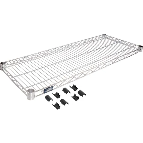 Design a strong, durable storage system to meet your needs with Nexel Chrome Wire Shelves and Posts. Solid shelf construction features thick diameter wire running front to back with additional truss supports to resist bending under heavy loads. Shelf collar slides over plastic snap-on sleeves for quick adjustment without disassembling the entire shelving unit. Clean open wire design will not collect dirt like solid shelves. Chrome plated finish.