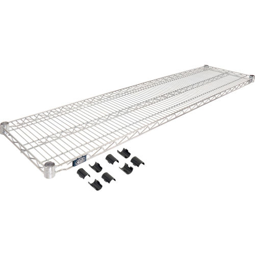 Design a strong, durable storage system to meet your needs with Nexel Chrome Wire Shelves and Posts. Solid shelf construction features thick diameter wire running front to back with additional truss supports to resist bending under heavy loads. Shelf collar slides over plastic snap-on sleeves for quick adjustment without disassembling the entire shelving unit. Clean open wire design will not collect dirt like solid shelves. Chrome plated finish.