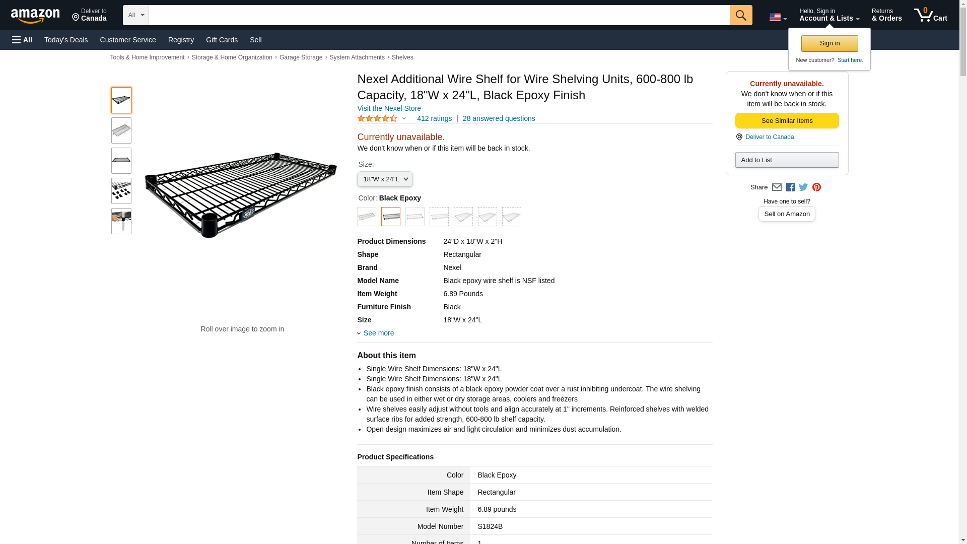 - Single Wire Shelf Dimensions: 18"W x 24"L