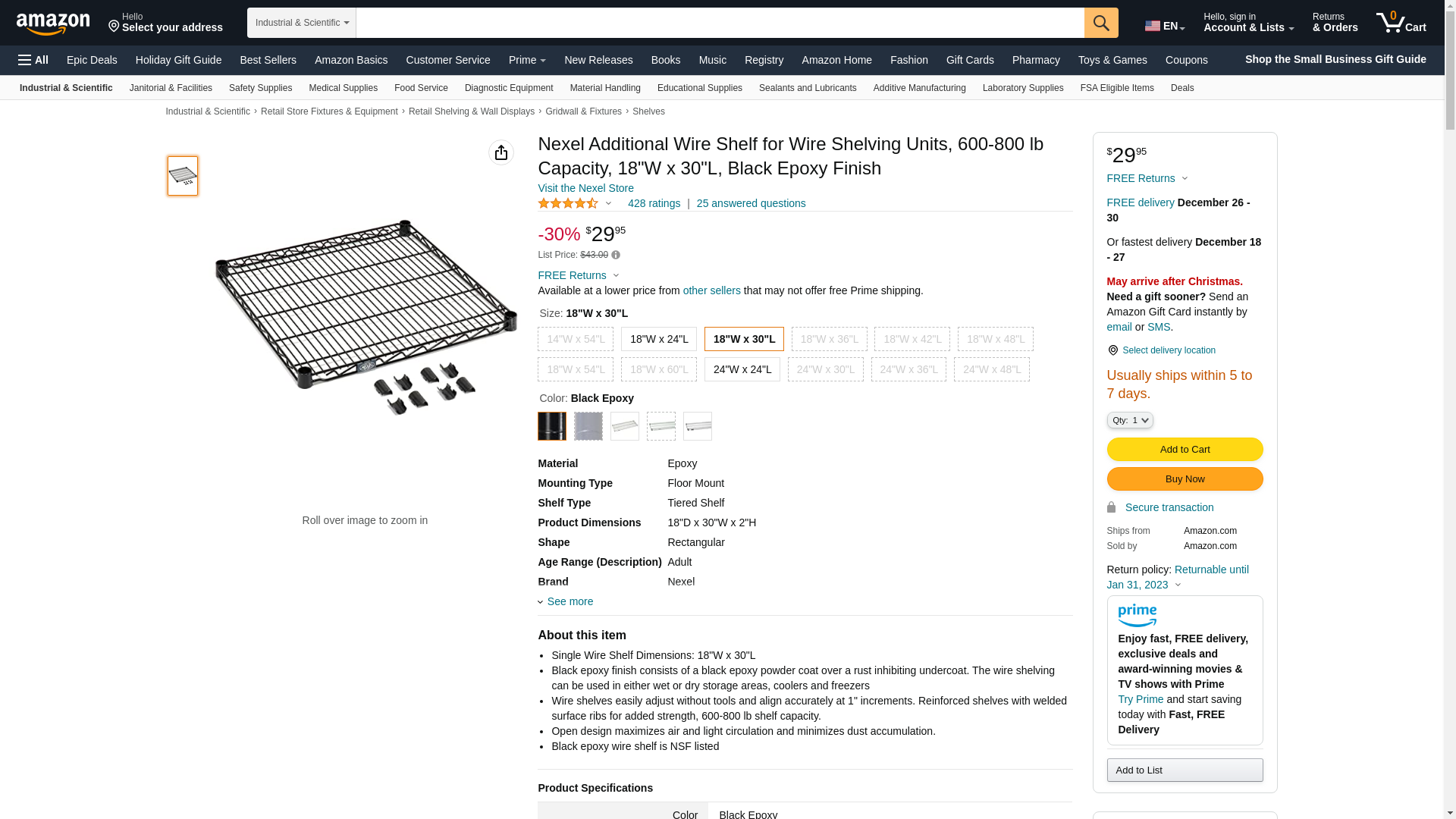 - Single Wire Shelf Dimensions: 18"W x 30"L