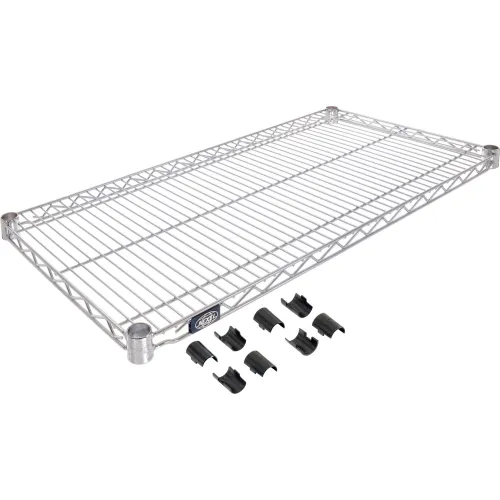 Design a strong, durable storage system to meet your needs with Nexel Chrome Wire Shelves and Posts. Solid shelf construction features thick diameter wire running front to back with additional truss supports to resist bending under heavy loads. Shelf collar slides over plastic snap-on sleeves for quick adjustment without disassembling the entire shelving unit. Clean open wire design will not collect dirt like solid shelves. Chrome plated finish.