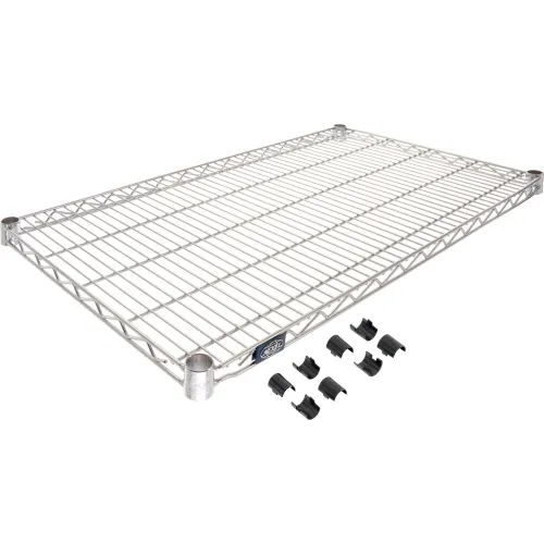 Design a strong, durable storage system to meet your needs with Nexel Chrome Wire Shelves and Posts. Solid shelf construction features thick diameter wire running front to back with additional truss supports to resist bending under heavy loads. Shelf collar slides over plastic snap-on sleeves for quick adjustment without disassembling the entire shelving unit. Clean open wire design will not collect dirt like solid shelves. Chrome plated finish.