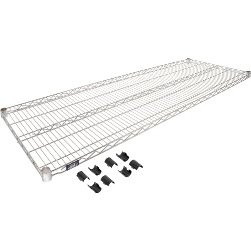 Design a strong, durable storage system to meet your needs with Nexel Chrome Wire Shelves and Posts. Solid shelf construction features thick diameter wire running front to back with additional truss supports to resist bending under heavy loads. Shelf collar slides over plastic snap-on sleeves for quick adjustment without disassembling the entire shelving unit. Clean open wire design will not collect dirt like solid shelves. Chrome plated finish.