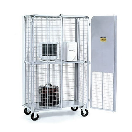 - All-welded components and wire mesh walls combine to make this truck extremely tough and strong. Center shelf folds down to create 2" - 32-1/2" areas of remains in the up positiopn to provide 66-1/2" of storage. Special door locking latch and padlock clasp (padlock not included) for secure stored contends. Rolls on 6" x 2" mold-on rubber casters, 2 swivel, 2 rigid