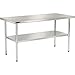 Work surface has 2 heavy gauge channel supports for added stability. Hemmed safety edges. Galvanized lower shelf is fully adjustable. Tubular legs are 1-5/8" diameter with 1" adjustable leveling feet. 500 lbs weight capacity evenly distributed.