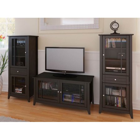 TV stand with two doors and one adjustable shelf. Curio with one drawer. Top door with three adjustable shelves. Bottom door with one adjustable shelf. CARB/EPP/SCS/FSC certified materials. Warranty: One year. Espresso textured lacquer and laminate finish. Made in Canada. Curio: 24 in. W x 17.5 in. D x 60 in. H. TV stand: 49 in. W x 21 in. D x 24.5 in. H. Curio Assembly Instructions. TV Stand Assembly Instructions. Elegance Collection from Nexera proposes a complete collection for your living room.