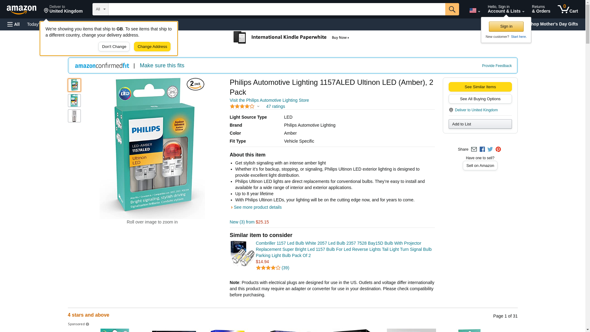 Philips Automotive Lighting 1157ALED Ultinon LED (Amber), 2 Pack