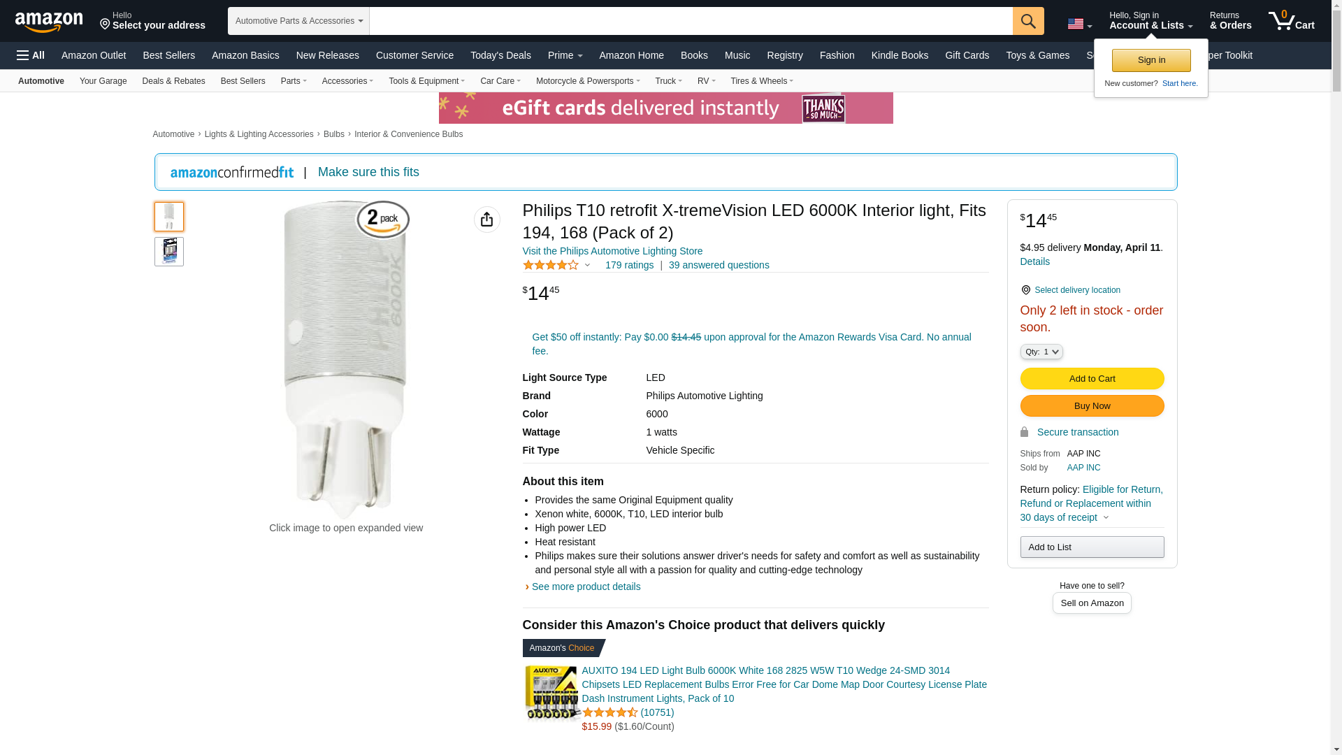 Philips T10 retrofit X-tremeVision LED 6000K Interior light, Fits 194, 168 (Pack of 2)