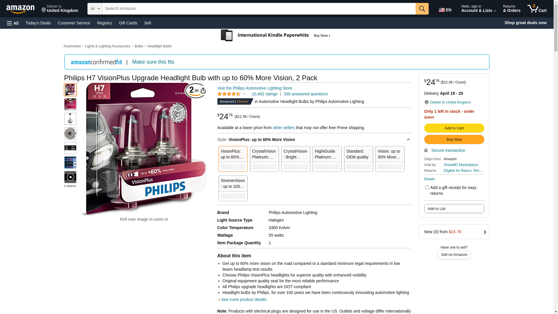Philips H7 VisionPlus Upgrade Headlight Bulb with up to 60% More Vision, 2 Pack