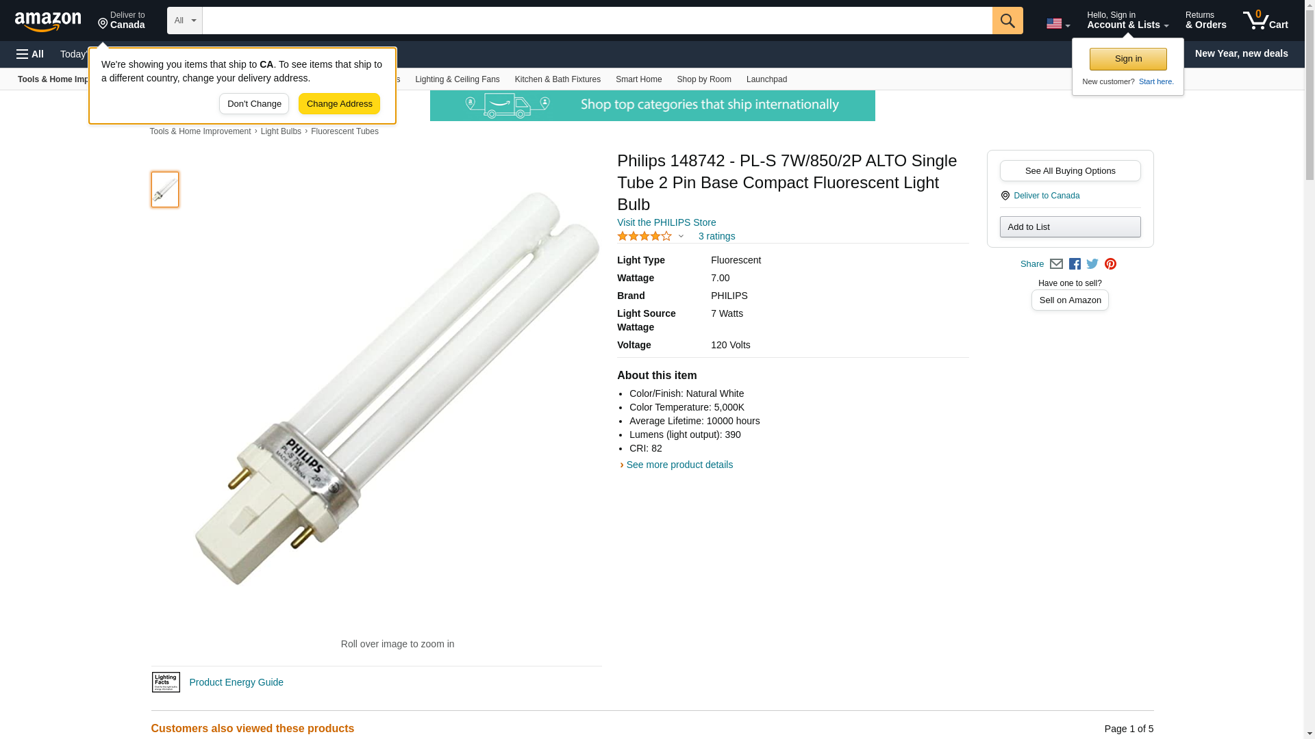 Philips 148742 - PL-S 7W/850/2P ALTO Single Tube 2 Pin Base Compact Fluorescent Light Bulb