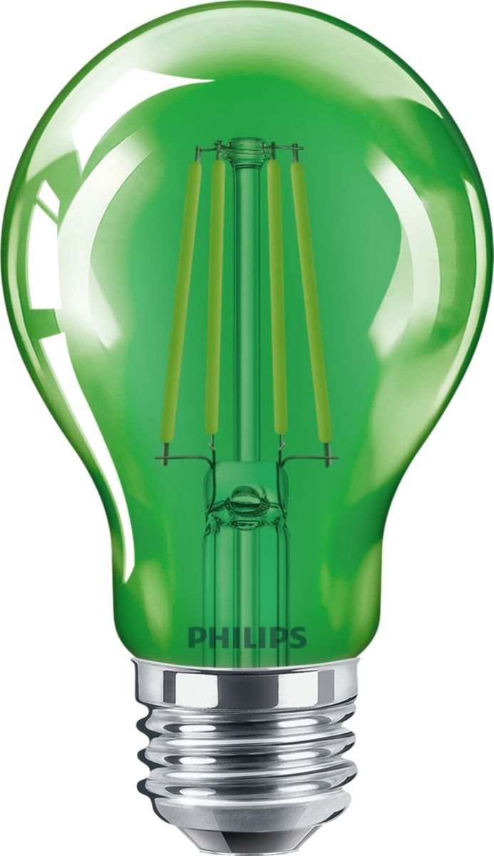 - GREEN LIGHT: Philips LED A19 Green Light Bulbs are perfect for special occasions and holidays. At 4-Watts, these 40-Watt equivalent LED light bulbs produces a bright green light that is perfect for providing a festive touch to your home lighting.