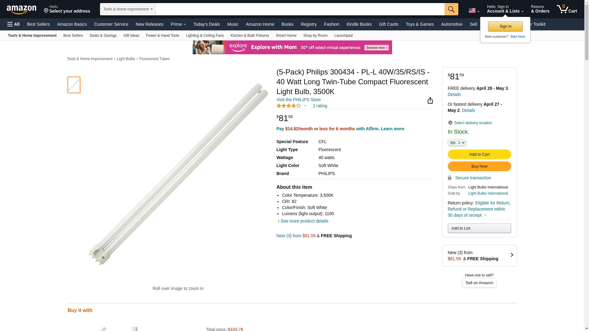 40 watt 120 volt PL-L 4-Pin (2G11) Base 3,500K Single Tube Compact Fluorescent Philips Light Bulb