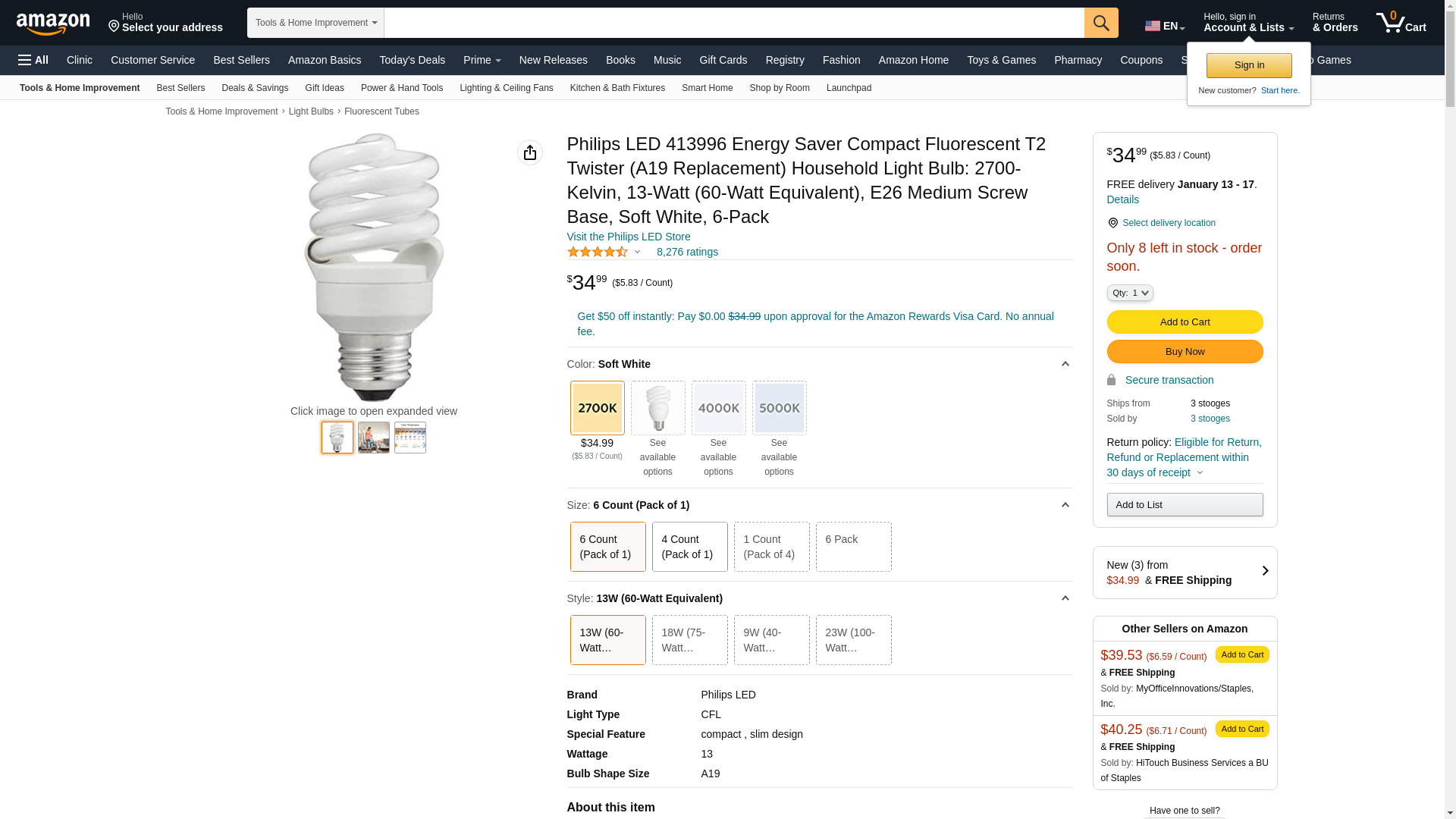 Philips 414045 60 Watt Equivalent Compact Fluorescent Twister Natural Light 5000K CFL Light Bulb, 6-pack, , . This 60...