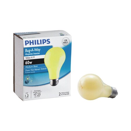 Philips PLC 60-Watt A19 Long-Life Bug Light Bulbs (2-Pack) feature 0.01 Lumen output and up to 1,350 hours of life each. These outdoor bulbs provide sufficient light for you to see at night without attracting bugs and fit in standard sockets for convenience.
