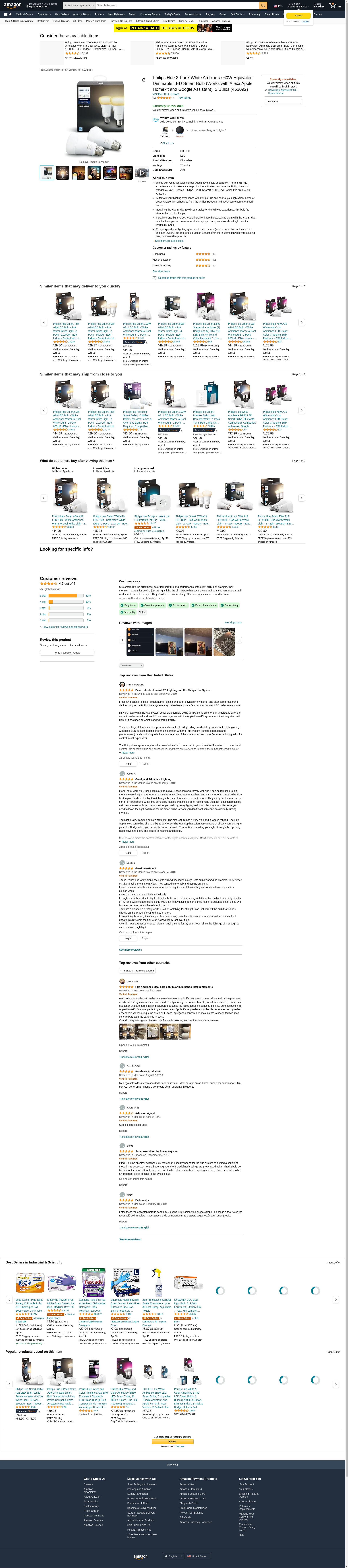 Philips Hue 2-Pack White Ambiance 60W Equivalent Dimmable LED Smart Bulb (Works with Alexa Apple Homekit and Google Assistant), 2 Bulbs (453092)