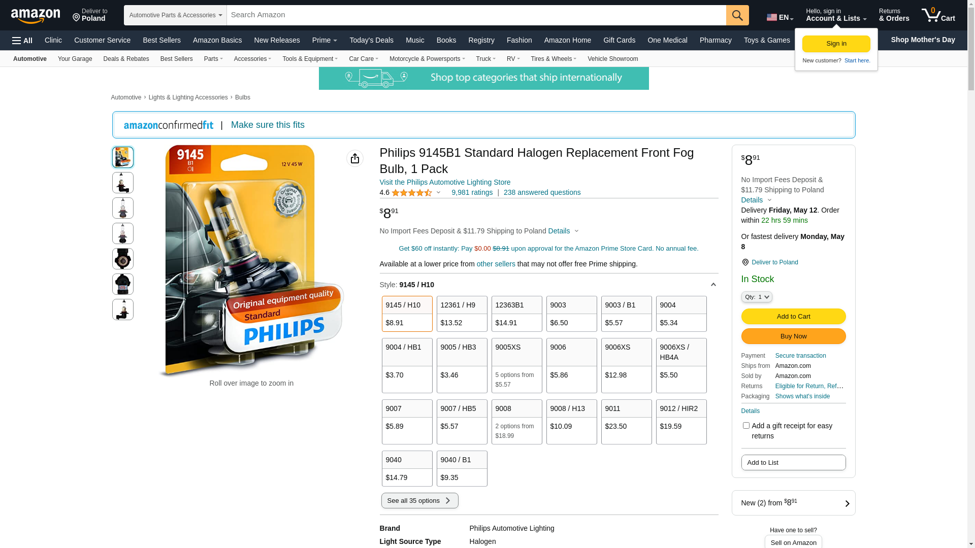 Philips 9145B1 Standard Halogen Replacement Front Fog Bulb, 1 Pack