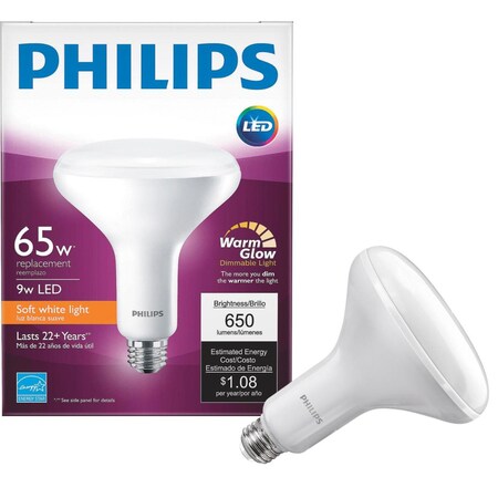 - Energy Efficient: Philips LED Dimmable BR40 Light Bulbs use roughly 80 percent less energy than 65 Watt Incandescent Bulbs while maintaining the look and feel of a classic light bulb; Philips LED light bulbs are Mercury free