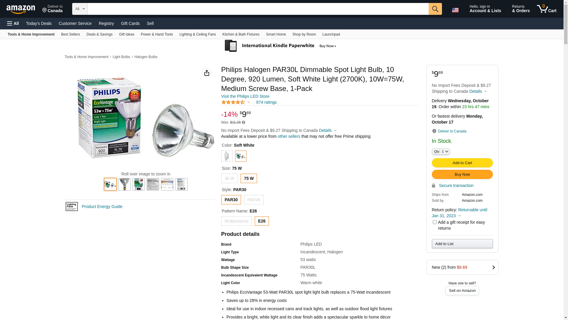 - Philips EcoVantage 53-Watt PAR30L spot light light bulb replaces a 75-Watt incandescent.Controller type:Push Button