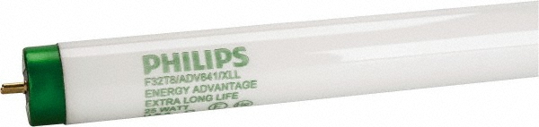 Philips Lighting 25-Watt T8 Medium 2-Pin G13 fluorescent lamp with green base, offers 2400 initial Lumens and 2330 mean Lumens for bright and crisp light output. It has color rendering index of 85. Lamp with 4100K color temperature rating radiates cool white light to the surrounding. It comes with average life of 52000 hours for program start ballast and 46000 hours for instant start ballast.