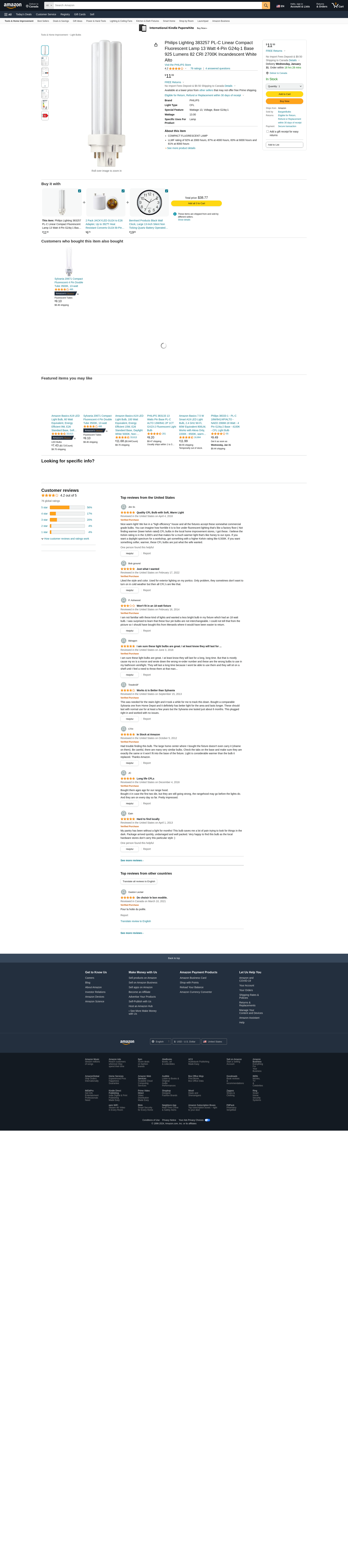 Philips Lighting 383257 PL-C Linear Compact Fluorescent Lamp 13 Watt 4-Pin G24q-1 Base 925 Lumens 82 CRI 2700K Incandescent White Alto