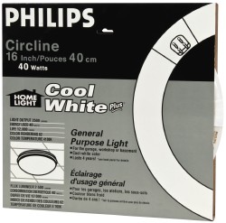 Philips 40-Watt 16 in. Cool White Circline Fluorescent Light Bulb delivers 2,500 Lumens of light and lasts up to 4 years or 12,000 life hours. It mounts to fixtures that accept 4-pin bulbs.