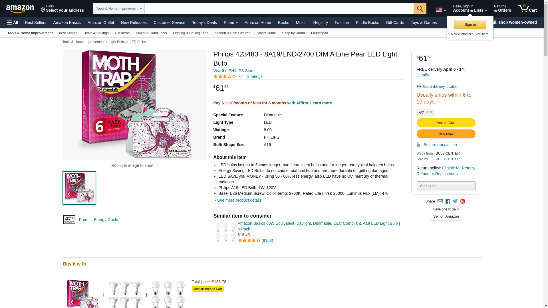 ![]() BulbAmerica | 423483 | 1 | 1 | 1 @ $14.99 | |