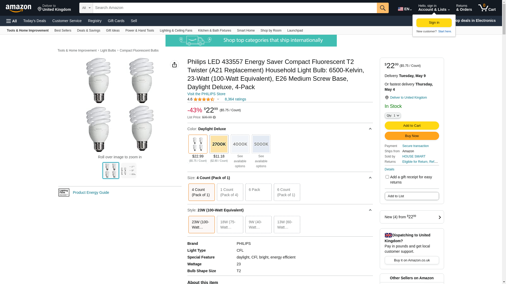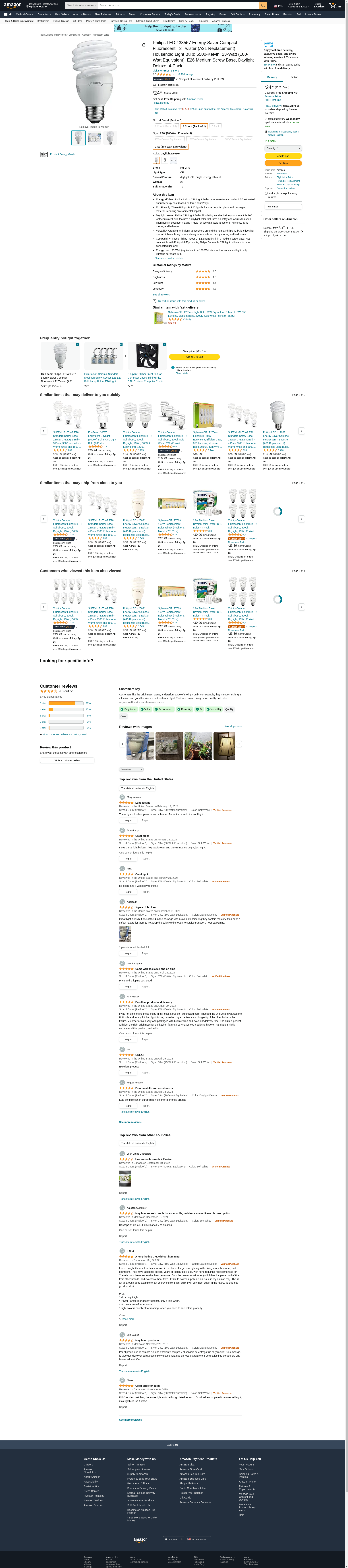 Philips LED 433557 Energy Saver Compact Fluorescent T2 Twister (A21 Replacement) Household Light Bulb: 6500-Kelvin, 23-Watt (100-Watt Equivalent), E26 Medium Screw Base, Daylight Deluxe, 4-Pack