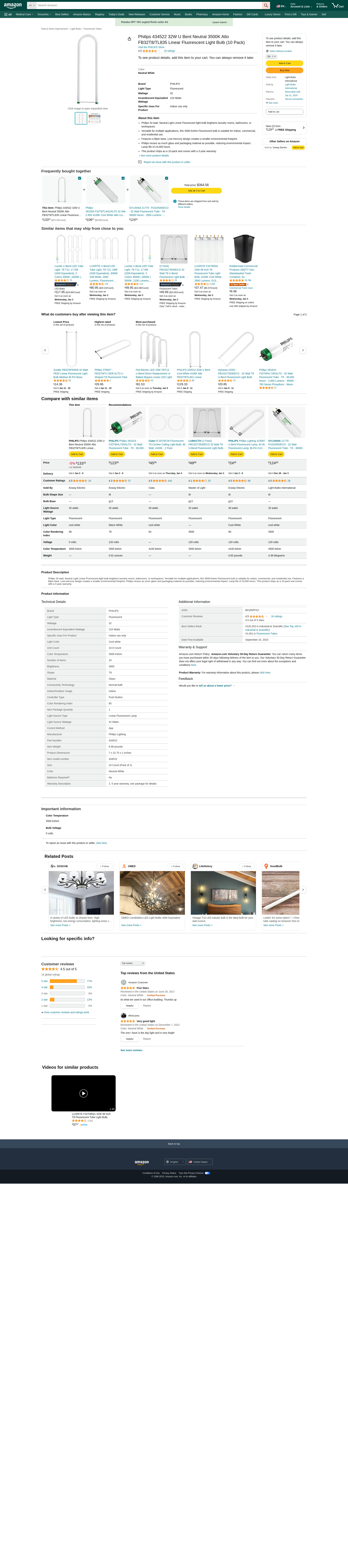 Philips 434522 32W U Bent Neutral 3500K Alto FB32T8/TL835 Linear Fluorescent Light Bulb (10 Pack)