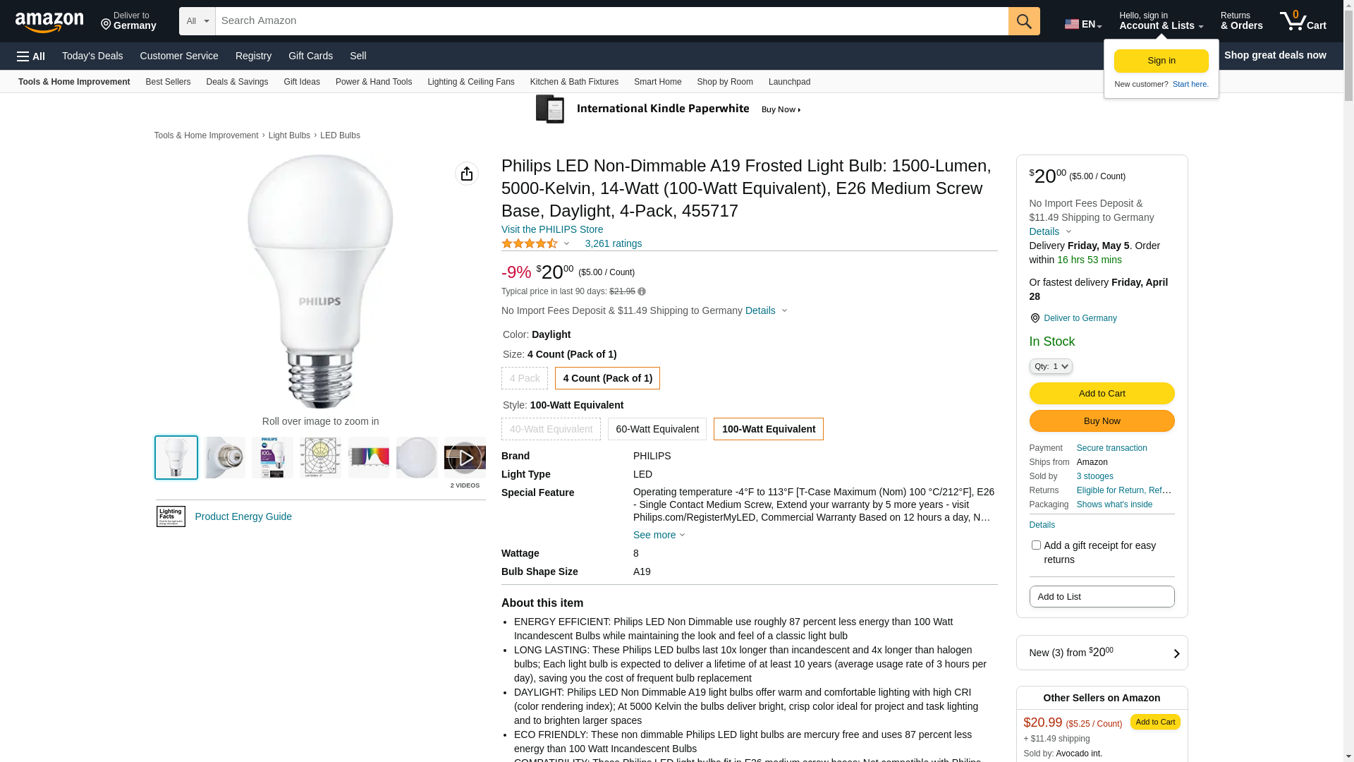 - Philips Everyday 100 Watt equivalent A19 consumes only 14 Watts of energy, saving you 87% in energy consumption