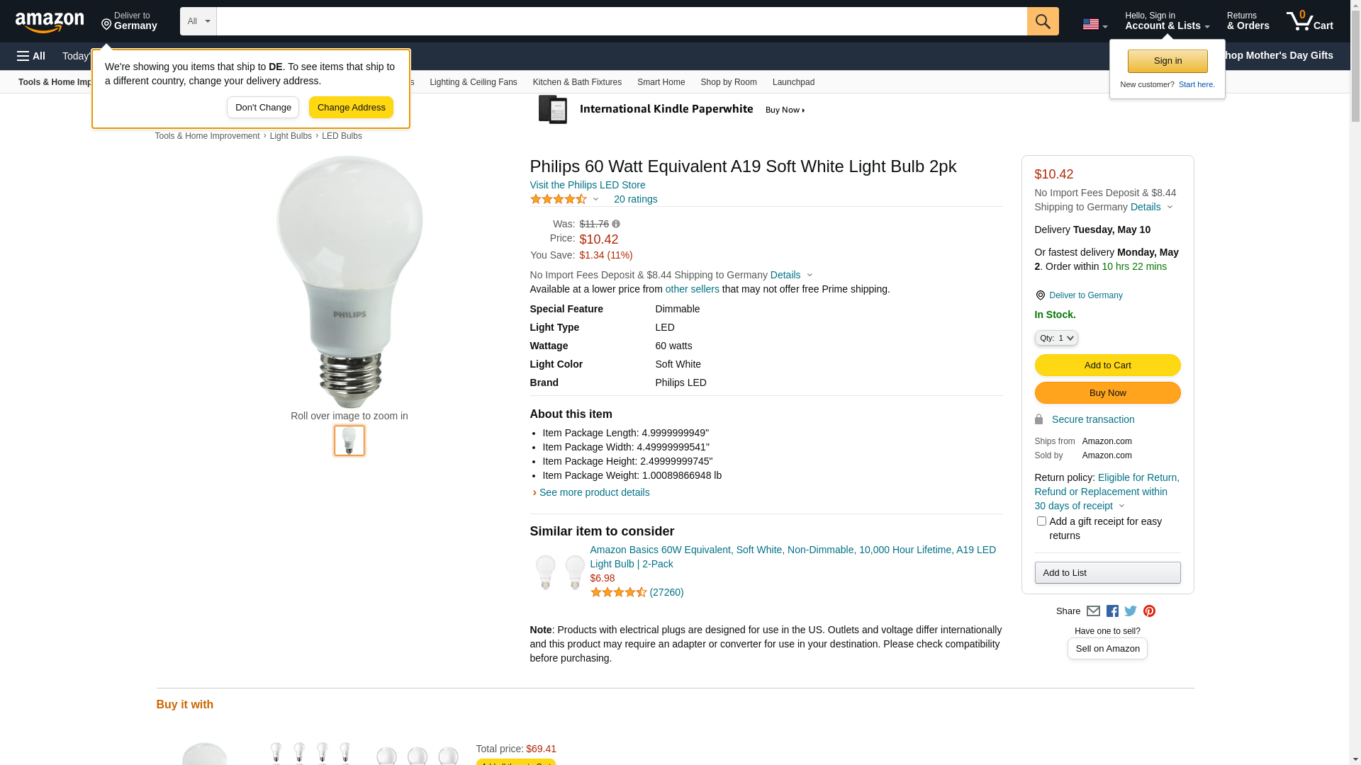 | Feature | This Philips 60 watt equivalent A19 LED bulb uses only 8.5 watts of energy, saving up to $62.03 over the life of the bulb (based on 3 hours/day, 11 cent/kWh, costs depend on rates and use) |