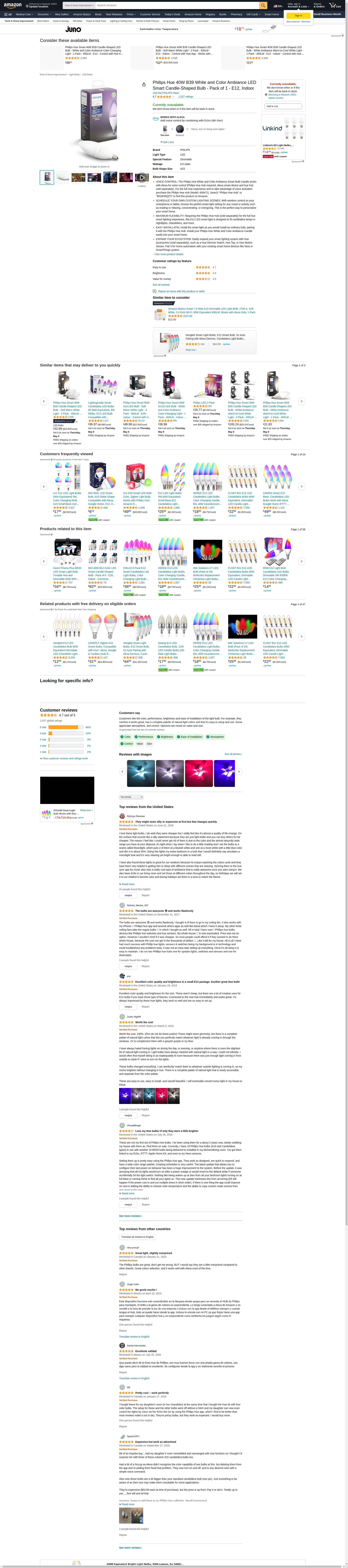 Philips Hue 40W B39 White and Color Ambiance LED Smart Candle-Shaped Bulb - Pack of 1 - E12, Indoor