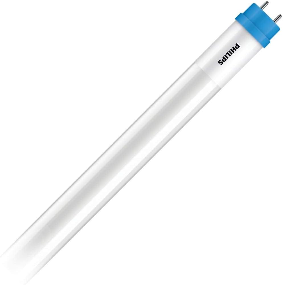Philips Lighting 14-Watt 2-Pin G13 Medium base high-output InstantFit LED lamp offers initial light output of 2100 Lumens. This T8 tubular shape lamp has current rating of 80 - 260-Milli-Amps and voltage rating of 120 - 277/347-Volts at 20000 - 120000-Hz. It has color rendering index of 80 and color temperature rating of 4000K to ensure optimal light level in the surrounding. This lamp features glass construction. It emits or distributes light at beam angle of 240-degree. This lamp has a dimensi