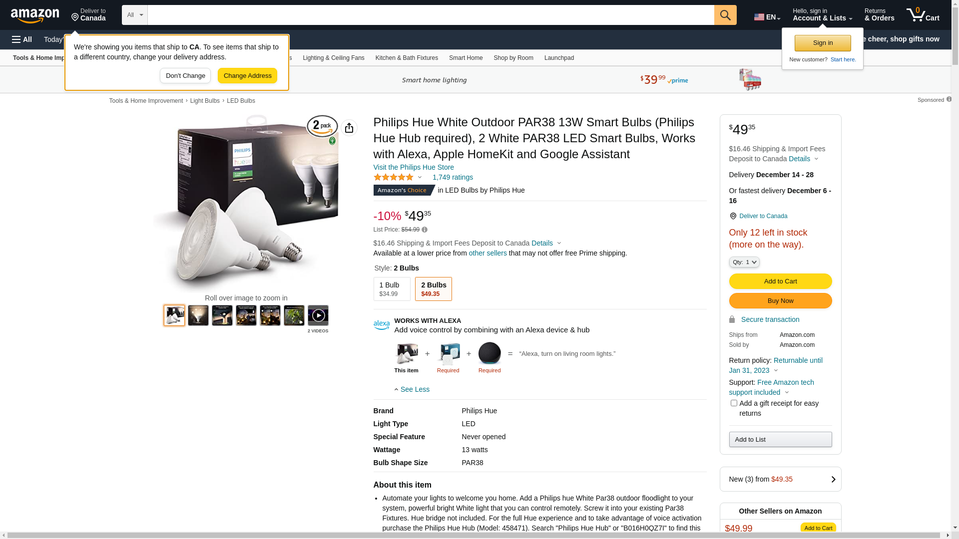 Philips Hue Smart PAR38 LED Bulb - Soft Warm White Light - 2 Pack - 1300LM - E26 - Outdoor - Weatherproof - Control with Hue App - Works with Alexa, Google Assistant and Apple Homekit