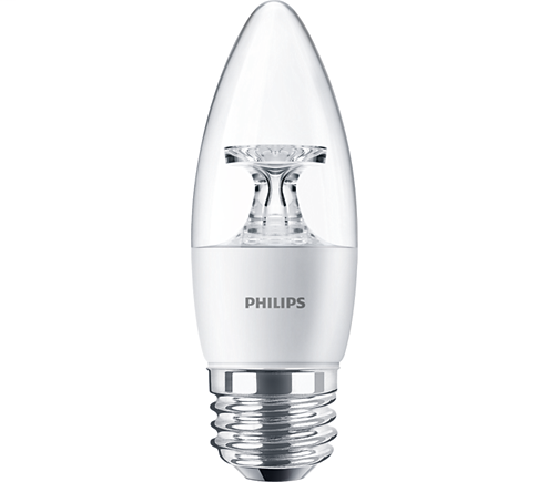 | Feature | Philips B11 Decorative Candle LED light bulbs are made to be seen with a warm glowing filament that shines with 300 lumens of soft white dimmable light, equivalent to 40-watt incandescents with 80% less energy use. These bulbs standard (E26) medium base fixtures. |