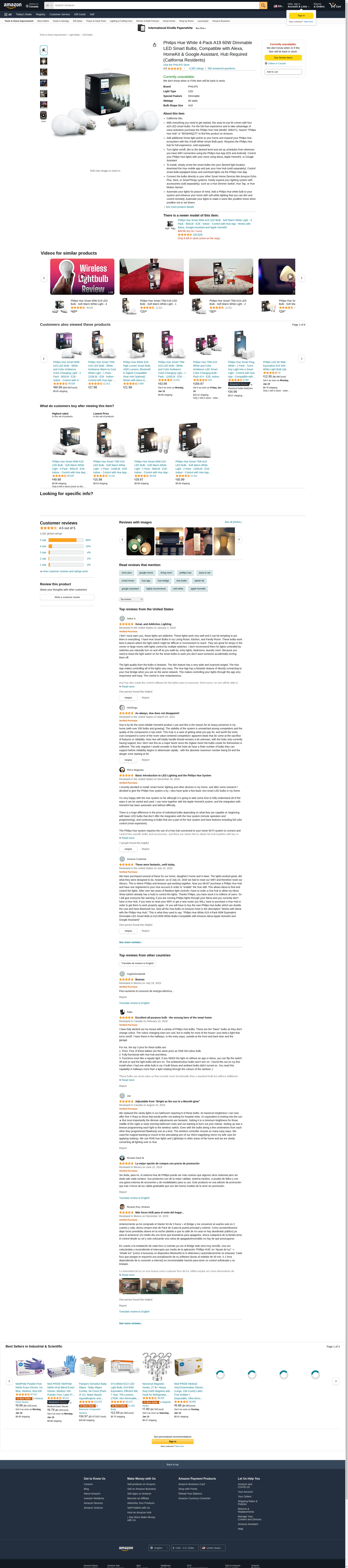 Philips Hue White 4-Pack A19 60W Dimmable LED Smart Bulbs, Compatible with Alexa, HomeKit & Google Assistant, Hub Required (California Residents)