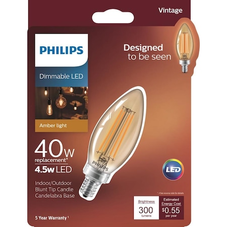 Philips LED Dimmable B11 Vintage Amber Light Bulb: 300-Lumen, 2000-Kelvin, 4.5 (40-Watt Equivalent), E26 Medium Screw Base, 1-Pack, Title 20 Compliant, 537621, 1 Count (Pack of 1)