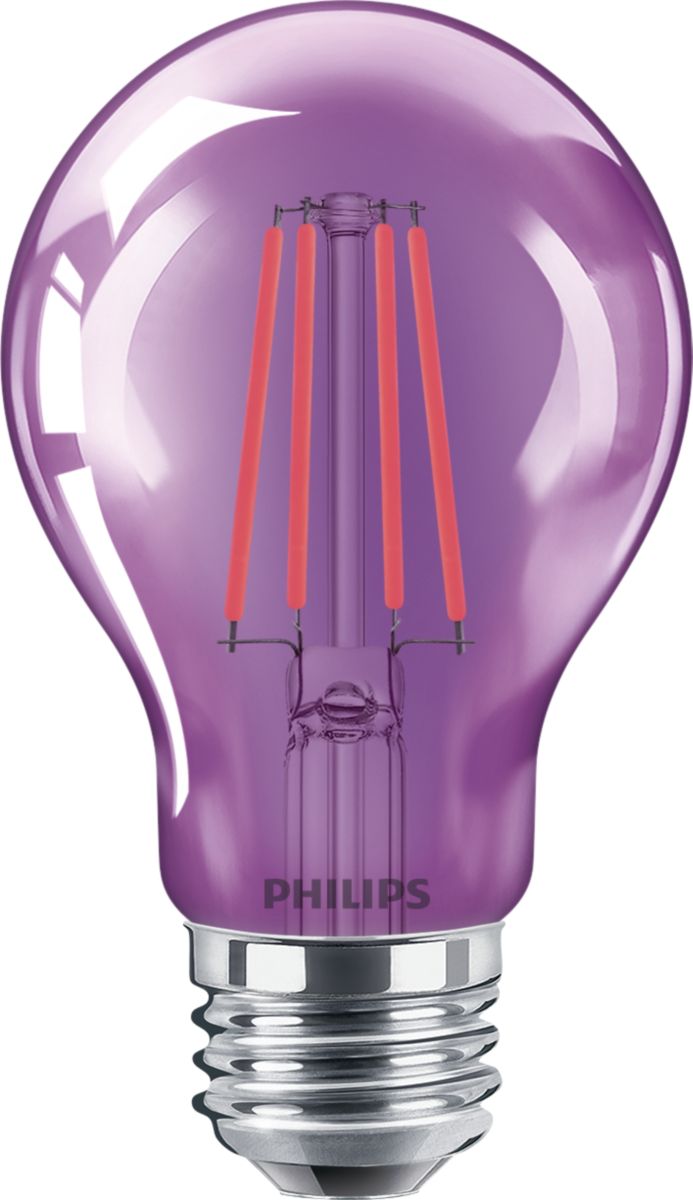 - Purple Light: Philips LED A19 Purple Light bulbs are perfect for special occasions and holidays. At 4-watts, these 40-watt equivalent LED light bulbs produces a bright purple Light that is perfect for providing a festive touch to your home lighting
