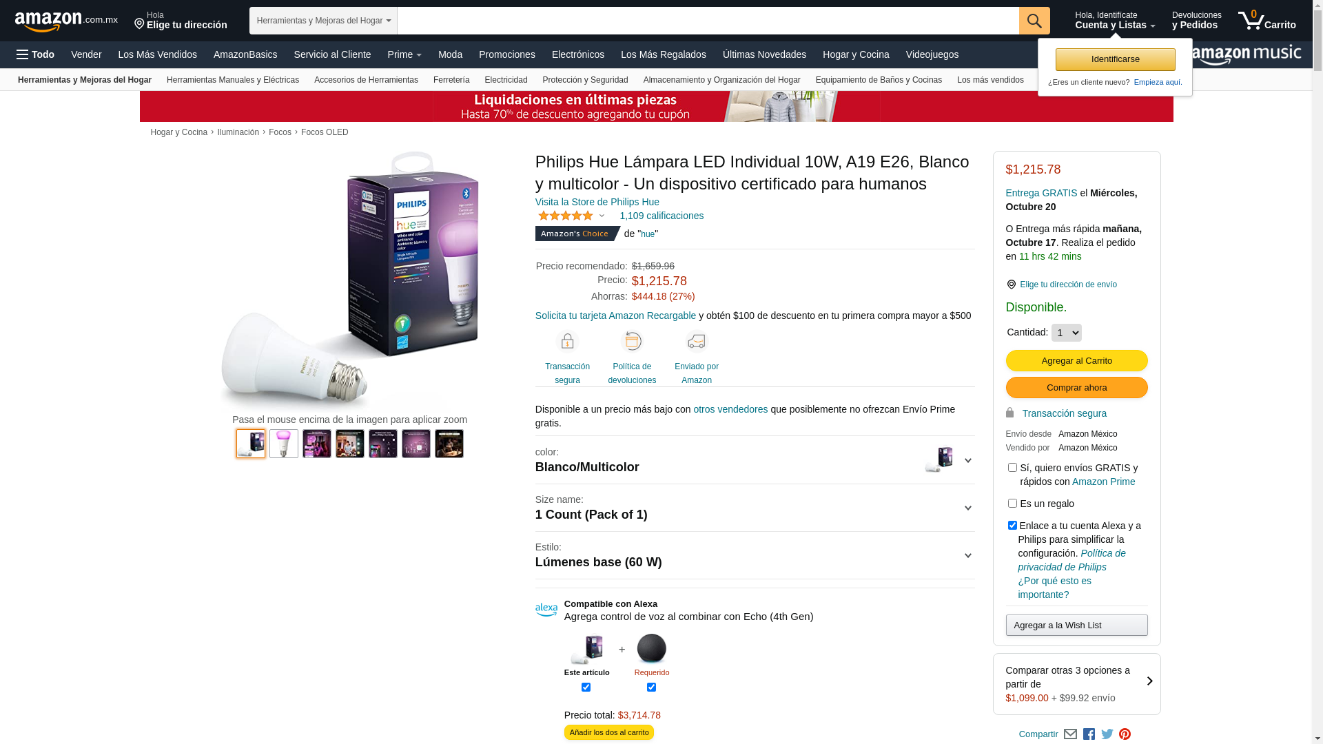 Philips Hue Smart 60W A19 LED Bulb - White and Color Ambiance Color-Changing Light - 1 Pack - 800LM - E26 - Indoor - Control with Hue App - Works with Alexa, Google Assistant and Apple Homekit