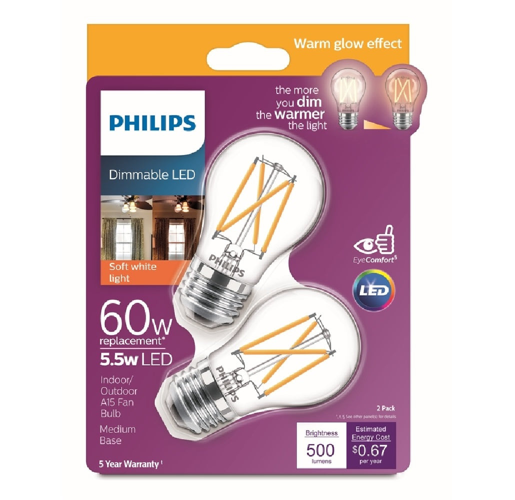 - WARM GLOW: Philips LED Dimmable A15 Light Bulbs offer warm and comfortable lighting with high CRI (color rendering index). Philips LEDs with a warm glow dimming effect offer a new experience for dimmable LEDs. These light bulbs’ gradual dimming feature dims from 2700 kelvin to the warm tones of traditional bulbs.