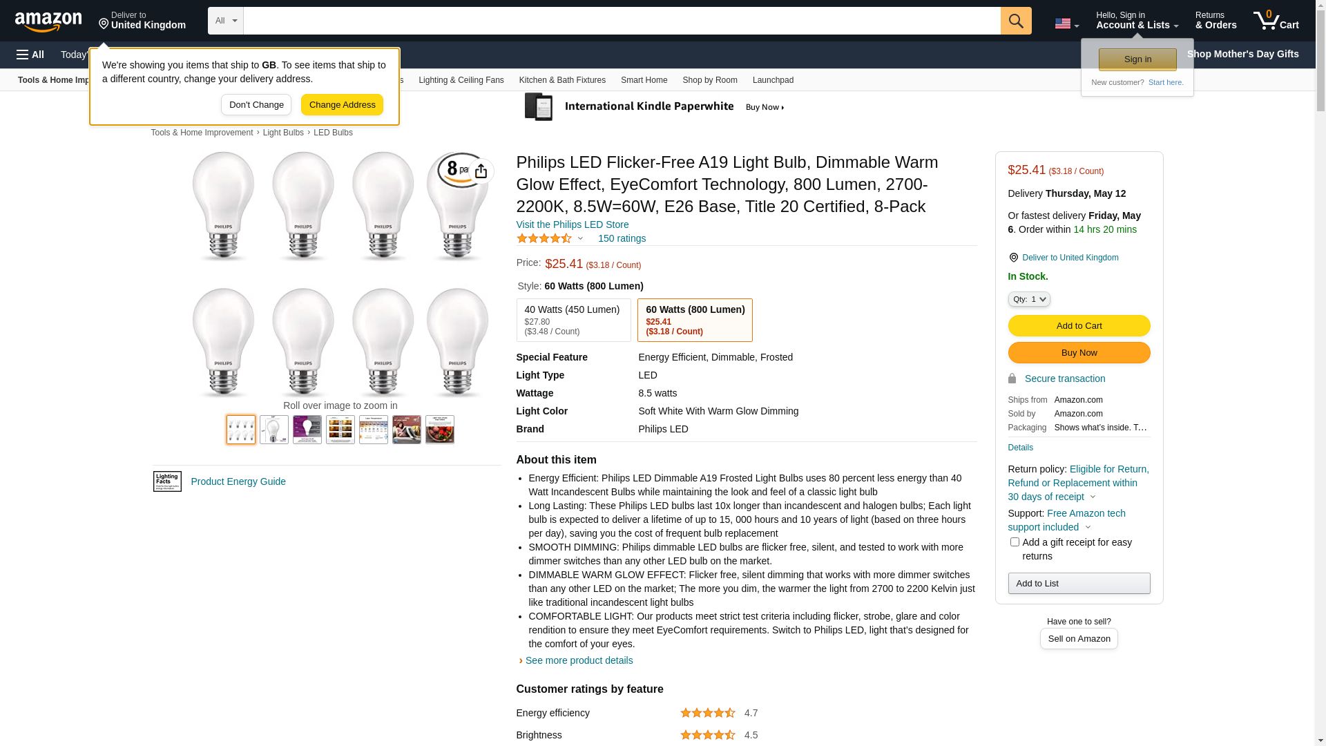 Philips LED Flicker-Free A19 Light Bulb, Dimmable Warm Glow Effect, EyeComfort Technology, 800 Lumen, 2700-2200K, 8.5W=60W, E26 Base, Title 20 Certified, 8-Pack