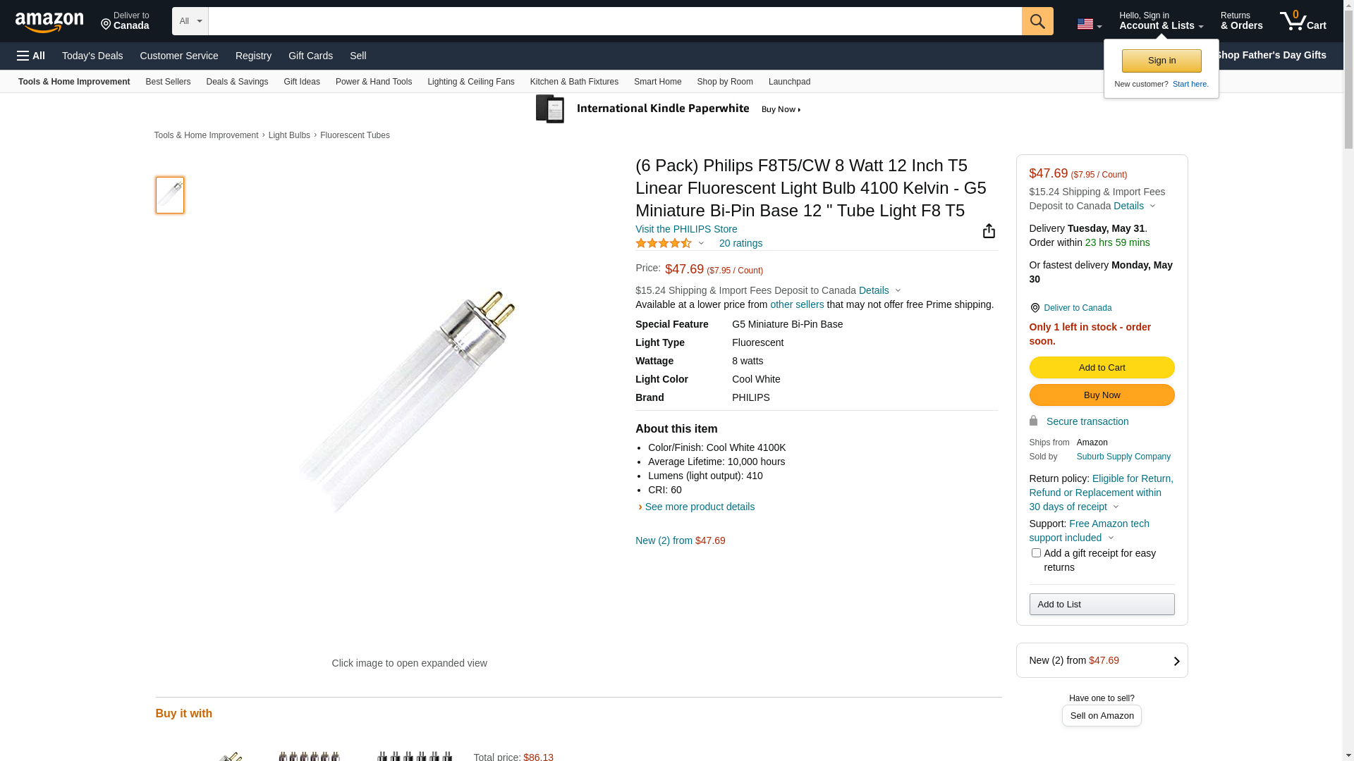 Lot of 2 Philips F8T5/CW Cool White Fluorescent Lamp Tube Light Bulb- 8-Watt- Cool White- Bi-Pin- Approximately 12" long- This item is NEW. You will receive 2 pieces.H44