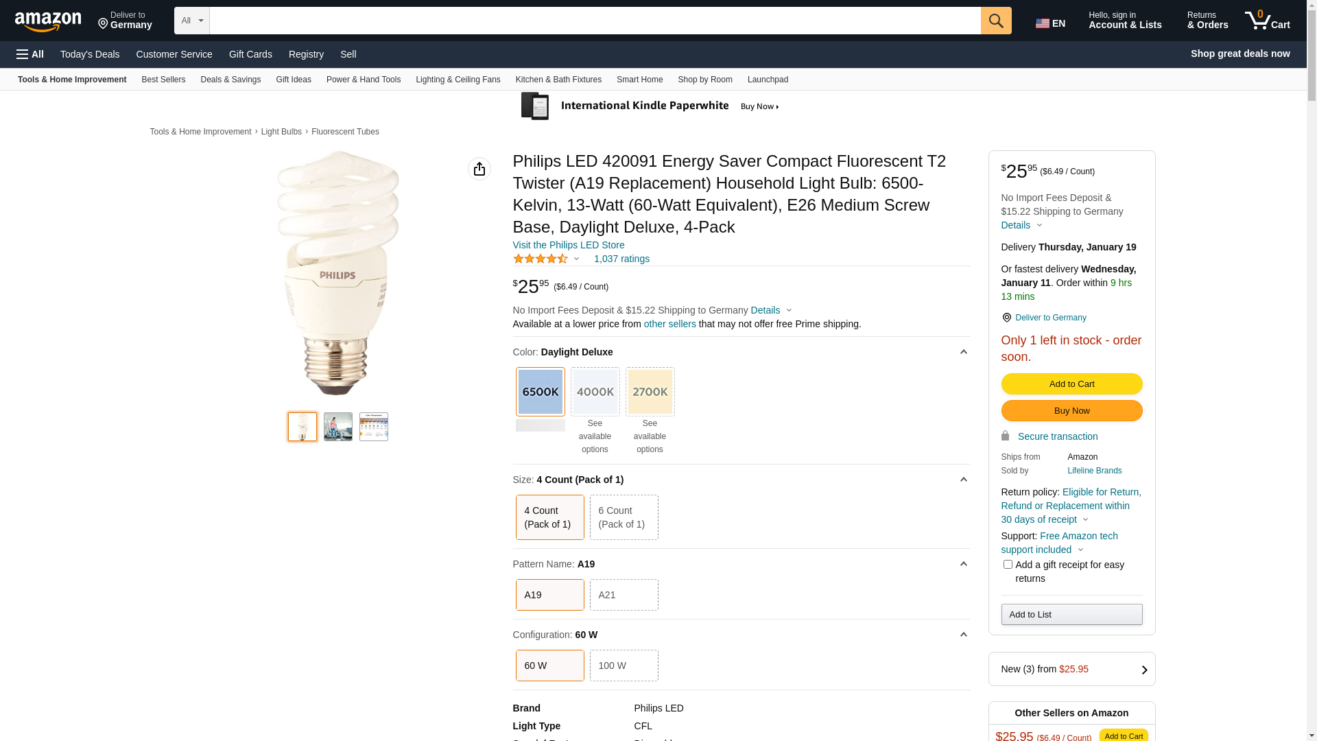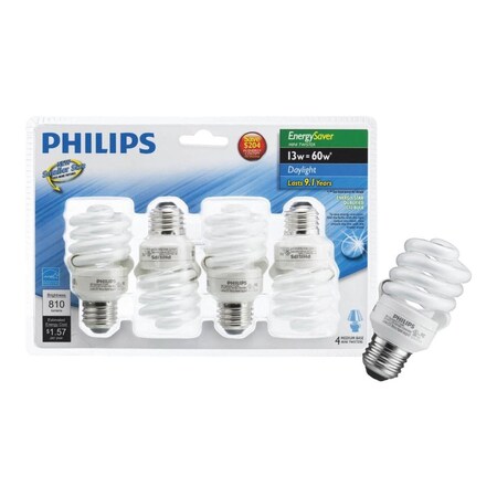 Philips LED 420091 Energy Saver Compact Fluorescent T2 Twister (A19 Replacement) Household Light Bulb: 6500-Kelvin, 13-Watt (60-Watt Equivalent), E26 Medium Screw Base, Daylight Deluxe, 4-Pack