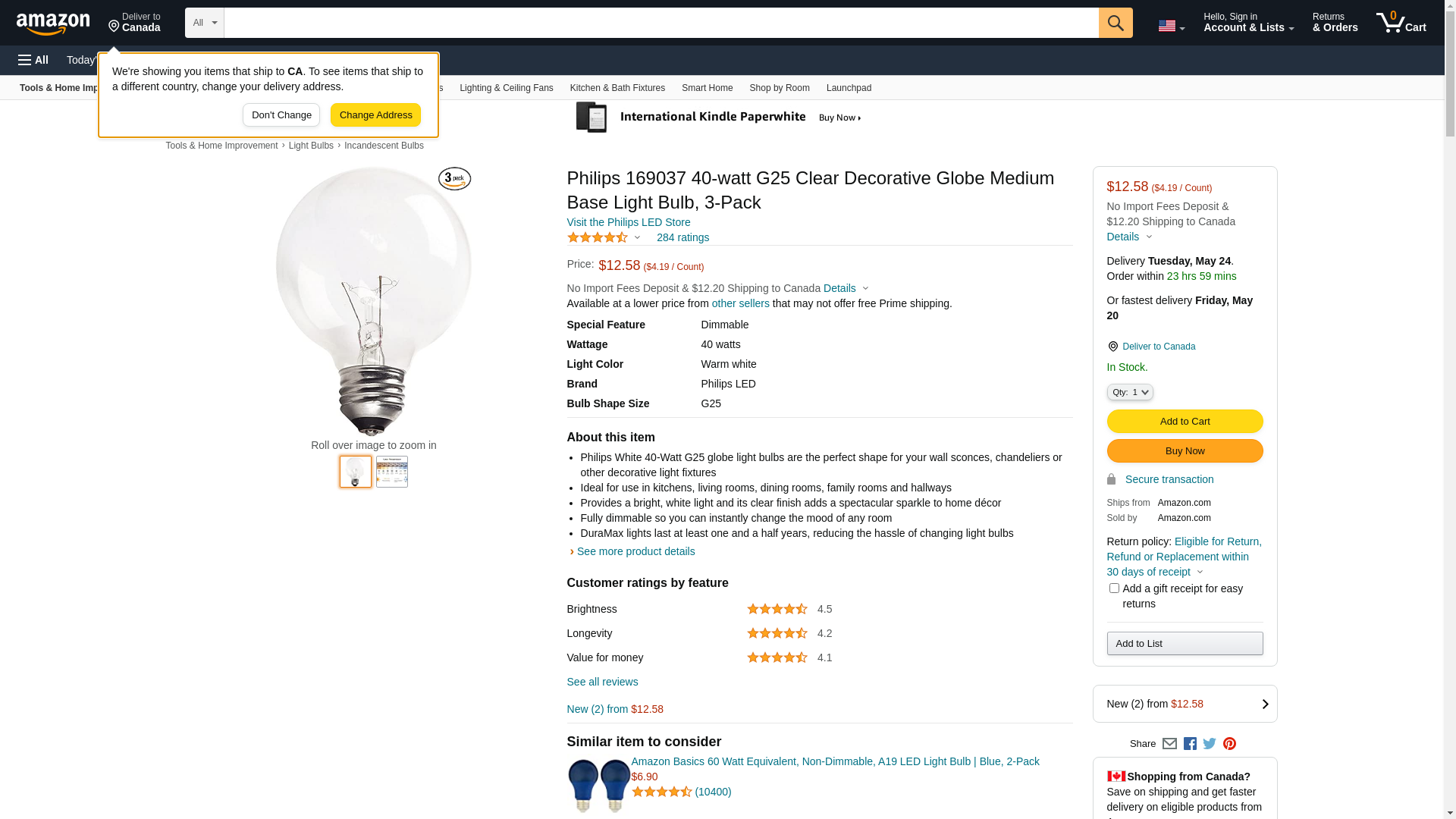 - Philips Globe G25 incendescent bulb, 40W, 120V,