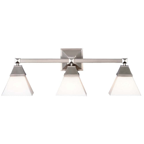 F473836 Features: -Three light vanity light.-Etched white opal glass.-Can be mounted in up or down position. Color/Finish: -Satin nickel finish. Specifications: -Three 60W medium base incandescent bulbs - not included. Dimensions: -Overall dimensions: 9''H x 27''W x 7''D. Collection: -Blush Collection.
