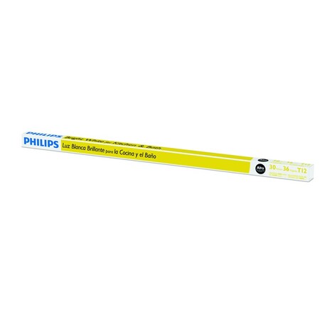 The Philips 30-Watt Bright White Linear Fluorescent Light Bulb (F30T12/BrightWhite/3000K) casts a crisp, bright white light that helps enhance skin tones and accurately shows colors. This fluorescent bulb can be used for your home or business's general purpose lighting needs. Using 30-Watt this bulb can shine up to 18,000 hours.; ; Brand Name: Philips Sub Brand: DirectFit Bulb Type: Linear Light Color: Bright White Length: 36 in. Bulb Base Type: G13 Bulb Shape Type: T12 Product Type: Fluorescent Bulb Watt Equivalence: 30 Watt Equivalence Number in Package: 1 pk Packaging Type: Sleeve Commercial or Residential: Commercial and Residential Finish: Frosted Indoor or Outdoor: Indoor and Outdoor Three Way Bulb: No California Title 20 Compliant: No Dimmable: No Average Rated Life: 18000 hr Color Rendering Index: 85 CRI Color Temperature: 3000 K Lumens: 2400 lm Watts: 30 W Diameter: 1.55 in. Volts: 120 V Energy Star Certified: No DLC Rated: No