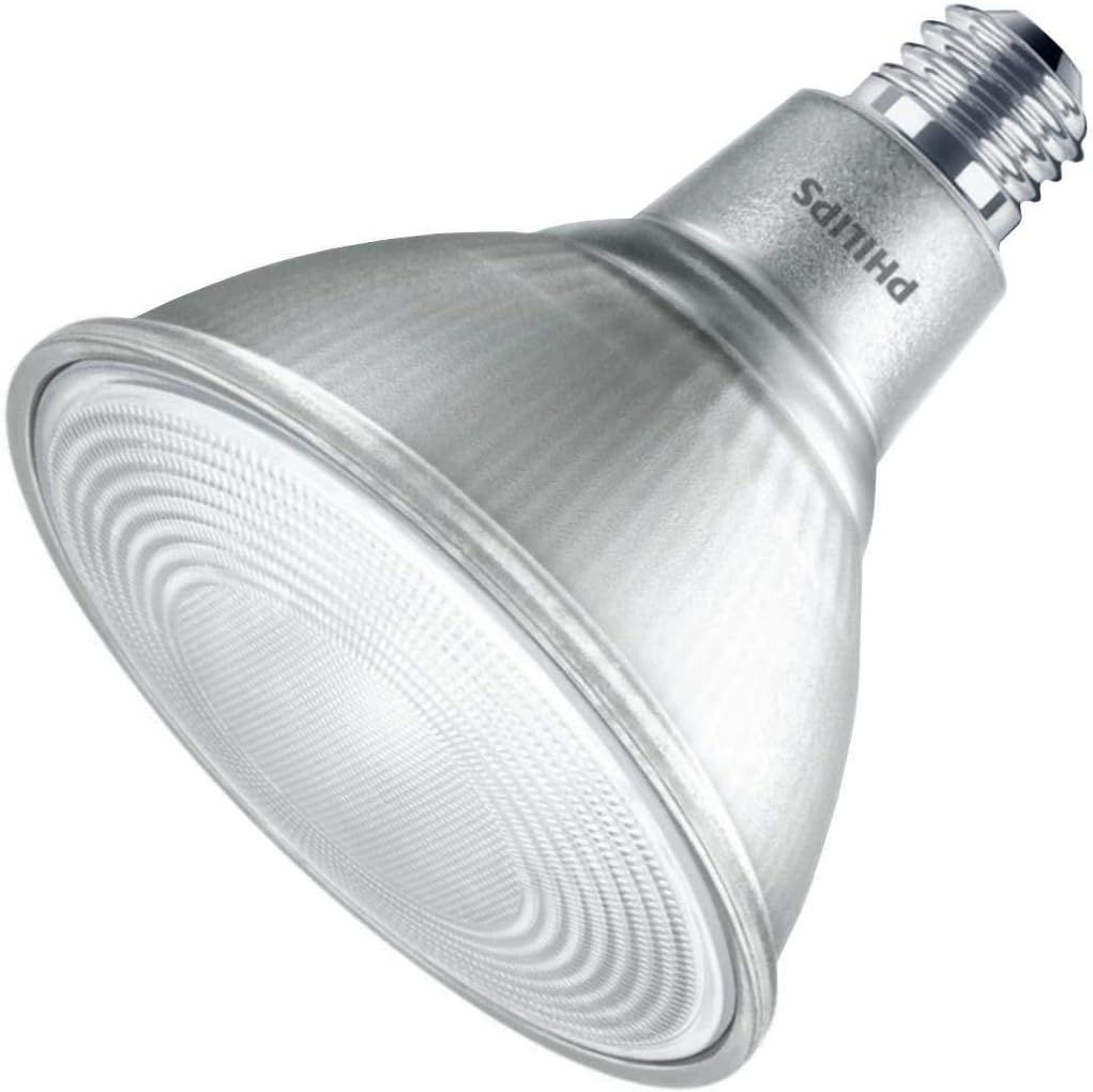 - Philips PAR38 LED classic glass light bulbs spotlight the details in your home with a 25-degree beam angle and 1200 lumens of bright white, dimmable light, equivalent to 120-watt incandescents with 80% less energy use. Appropriate for indoor and outdoor use, these bulbs fit medium base (E26) fixtures and measure 5.6 inches tall with a bulb diameter of 8.66 inches. These bulbs are manufactured for California residents only.