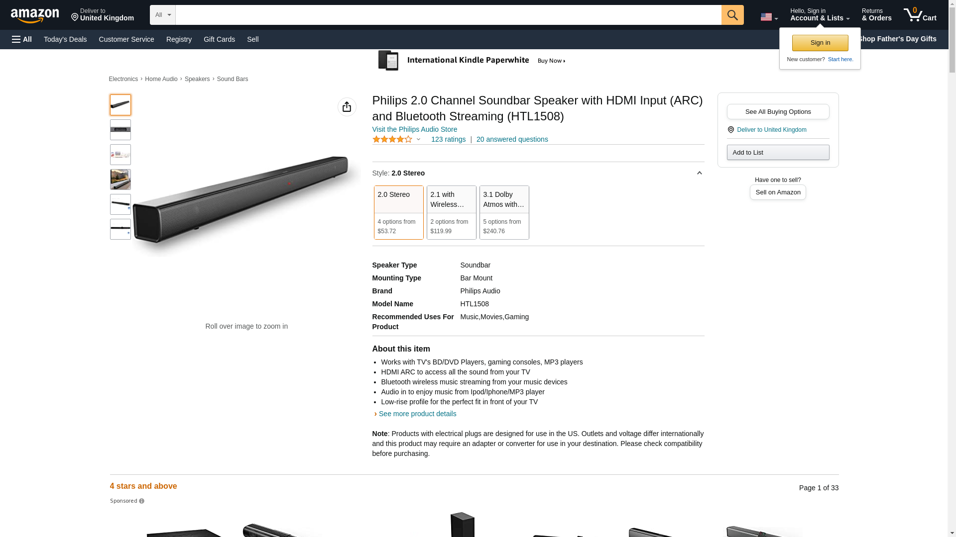 Philips 2.0 Channel Soundbar Speaker with HDMI Input (ARC) and Bluetooth Streaming (HTL1508)